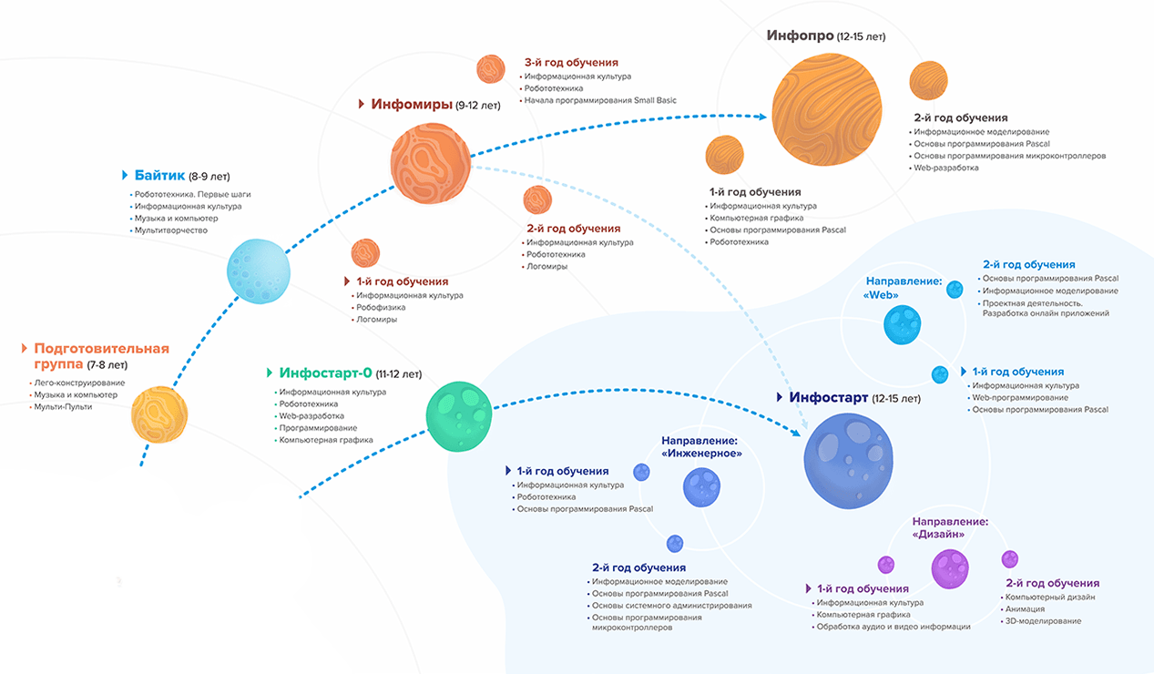 1 год обучения Информационная культураПрограмма для будущих программистов. Основные особенности — глубокое погружение в современные подходы программирования и робототехники, разработка проектов на профессиональном уровне, решение производственных задач в условиях учебной среды.